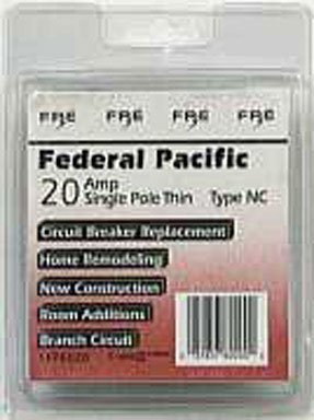 FEDERAL PACIFIC SINGLE POLE THIN CIRCUIT BREAKER 1/2" 20 amp, 120/240 vac Non-interchangeable 10,000 AIR Switch indicator Switch rated Plug-in Fits Federal Pacific-FPE (Stablock) panels Standard overload and short circuit protection in FPE load centers ETL listed